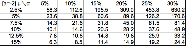 元本割れの場合と違い2倍になることをクリアする課題が加わるため、時間がオフセットを履くことになります。a=0の場合に相当する漸近線は定量的には「ln2/μ」となります。これは72の法則の解析的な形であり、上記a=0のテーブルが72の法則で求められる値とほぼ一致します。