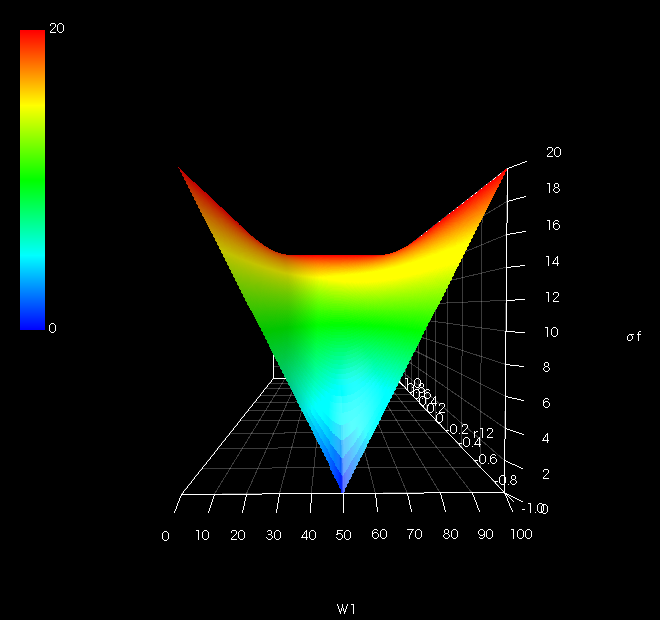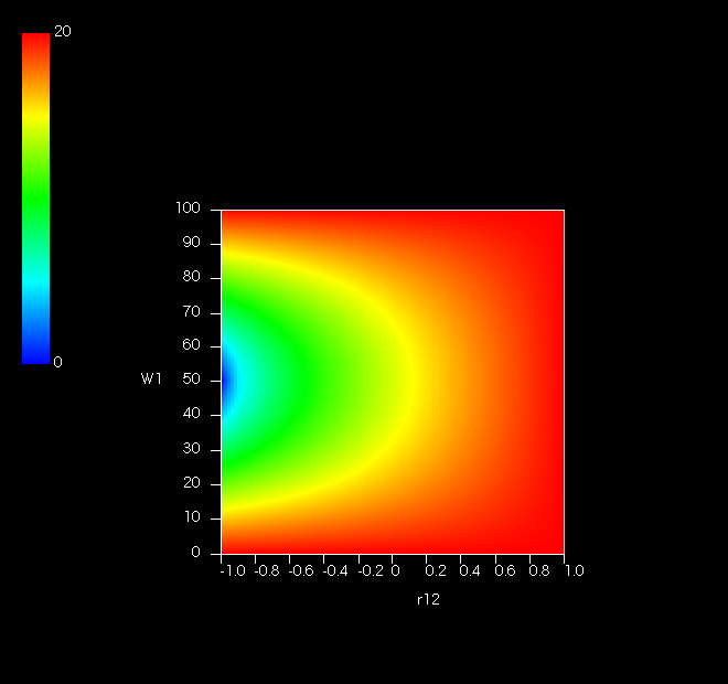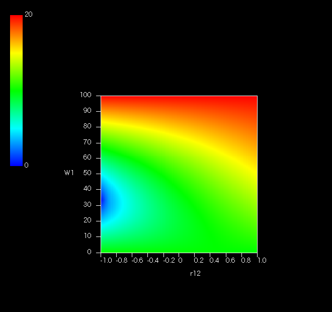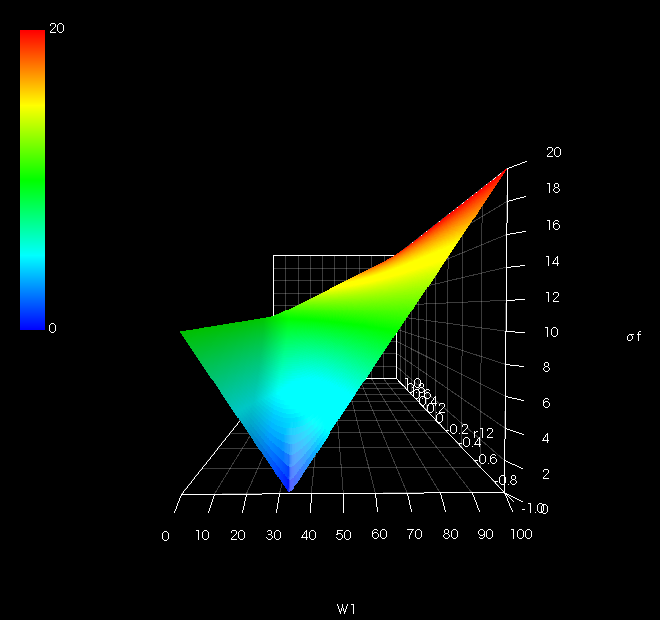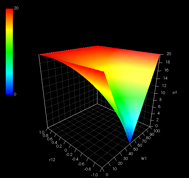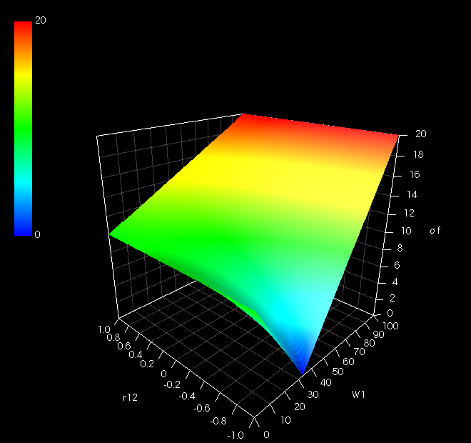 これらを踏まえ、資産1の割合(W1)と資産12間の相関係数(r12)、および合成リターン(R)を軸として合成リスク(σf)をプロットします。