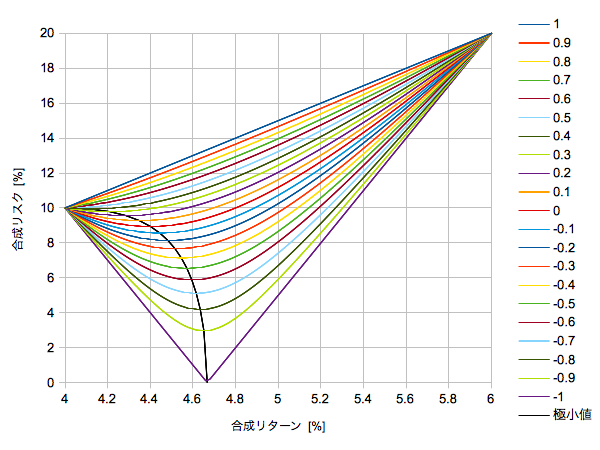 二次元版(ライン)は三次元版における相関係数一定の断面を切り取り、ウェイトを合成リターンに置き換えたものです。それぞれのラインが相関係数ごとの「有効(効率的)フロンティア」に相当します。