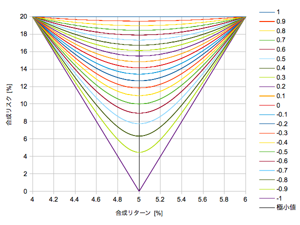 合成リスクの標準形で遊んでみる」等で考えたように、合成リスクの極小値をとるウェイトおよびその時の合成リスクを個々のシグマと相関係数の関数として求めることができます。