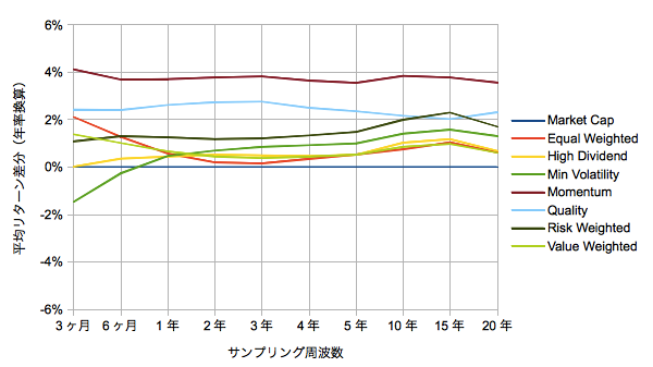 全体の期間は「Minimum Volatility」で律速する1988/05/E-2014/08/Eとします。あくまでこの期間の結果であることにご留意願います。USD建ての場合の円換算は日銀のドル円を使っています。これらの指数における以下の統計量のサンプリング周波数(計測期間)依存を考えます。