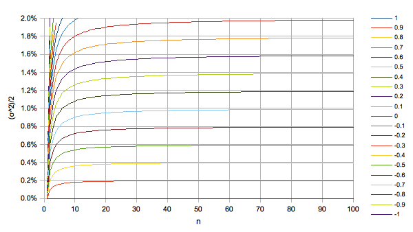 シグマで失われるリターン「(σ^2)/2」のうちの「(1-1/n)(1-r)」がキャンセルされて戻ってくることがわかります。この項を大きくするためにはnを大きくする、またはrを小さくすることが必要です。