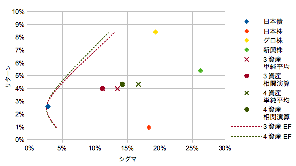 分散投資ということで新興株を加えて3資産から4資産にしても「11.2%→14.2%」とリスクは減るどころか増えてしまいました。リスクの大きなものを混ぜれば分散で低減できる以上に平均が上がってしまうことがあることを示しています。ただし「16.7%→14.2%」のように単純平均よりは小さくなるという分散投資(相関)の効果は健在です。
