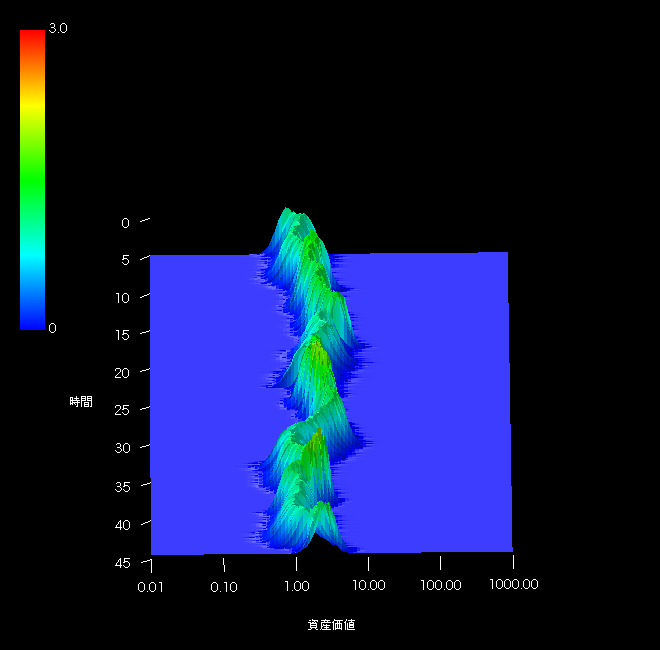 数学的に書けば、「累積分布=∫確率密度・d(資産価値)」の積分の中身「確率密度・d(資産価値)」をZ軸にプロットしたものです。
