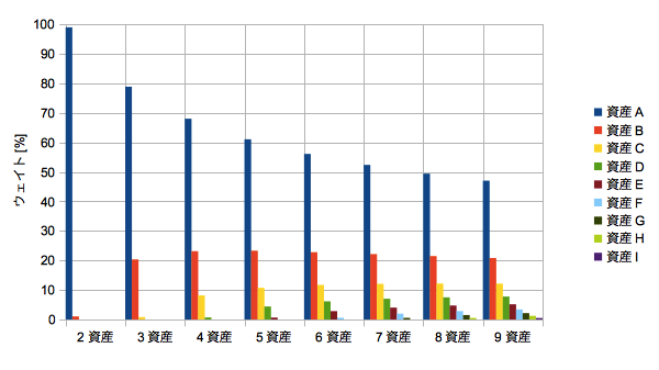まあそれでもたかだか9資産までしか計算していないので、nを大きくすればこの差はrで律速するのに対して相対的に小さくなるとは思いますが。
