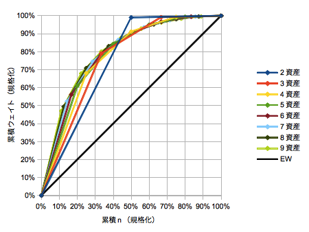 線形補間で定義した「時価ライクウェイト」のモデルを改変します。最大最小との差が2桁、資産数n=2~9は同様とし、3資産、4資産とnが増えるにつれて間を「ガンマ=-1」の関数型(ベキ乗)で補間して全体のウェイトが100%になるように配分を決めます(ガンマ=1が線形補間に相当)。このガンマによってウェイトヒストグラムを曲げることが狙いです。比較対象として「n資産等配分」を考えます。