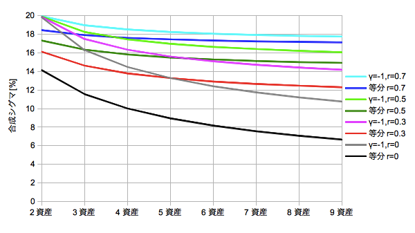 例えば、r=0において同じ合成シグマにするために必要なnを見ると、γ=-1の9資産がイコールウェイトの4資産に相当し、線形補間より差が広がっていることが分かります。これはヒストグラムが線形補間(γ=1)に比べてガンマが立った実際の時価加重に近い形状をしていることからも分かるように(参考「