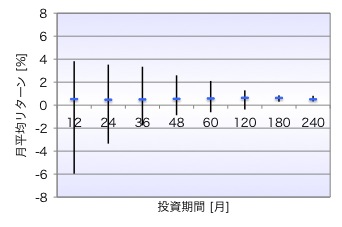 「1ヶ月でも1年でも10年でも期間に関係なくそれらを1回の投資とするならば、その1回の投資におけるリターンのバラツキ(これをリスクと言っている)は期間が長いほど小さくなる」