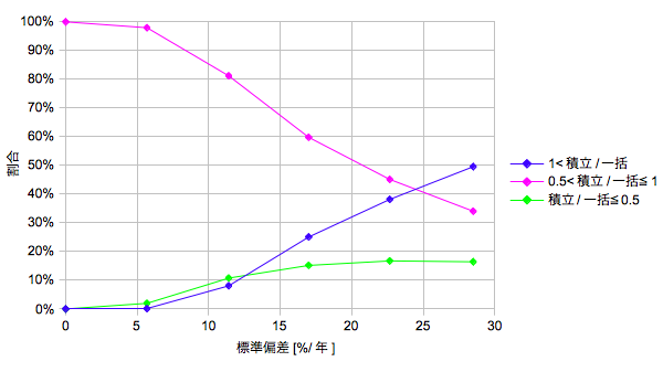 主要な演算結果である①「積立/一括」の平均値と中央値、②「積立/一括」の所定値に対する確率分布、③一括と積立の象限確率(積立マジックマトリクス)について、横軸を標準偏差としてプロットします。