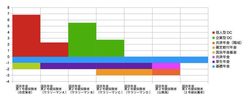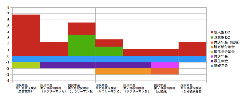 この改正について、いわゆる年金の階層構造を模式図で表してみました。紛らわしくて恐縮ですが、基礎年金や厚生年金などDC以外は高さ1としてマイナス側にプロットしています。企業型DCと個人型DCは拠出限度月額に応じて高さを変えてプラス側にプロットしています(単位万円)。