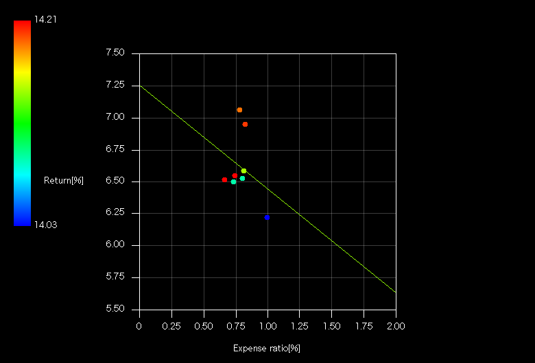 バラツキが大きいこととNが少ないため精度が出ていないように見えます。経費率ではない他の成分(ポートフォリオや運用技術など)の違いが表れていると考えています。