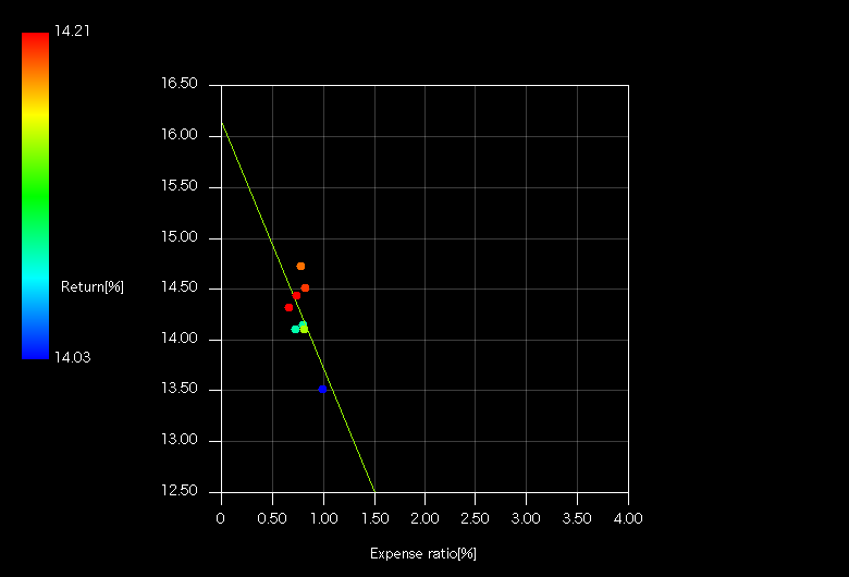 バラツキが大きいこととNが少ないため精度が出ていないように見えます。経費率ではない他の成分(ポートフォリオや運用技術など)の違いが表れていると考えています。
