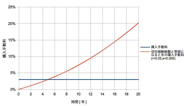で信託報酬総額が購入手数料に一致することがわかります。重要なのは3%/0.5%/年=6年より早いという点です(リターンにより元本が増えるため)。これも複利である信託報酬の方が早い時間で高額になるので重要という意味になります。