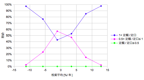 主要な演算結果である①「定額/定口」の平均値と中央値、②「定額/定口」の所定値に対する確率分布、③指数と残口数の象限確率(残存率マトリクス)について、横軸を相乗平均としてプロットします。