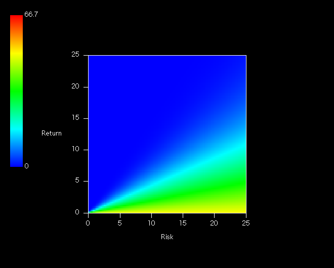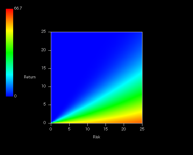 X軸にリスク、Y軸にリターンをとったリスクリターン平面において、Z軸に元本割れ確率をとった二次元メッシュマップを描いてみます。