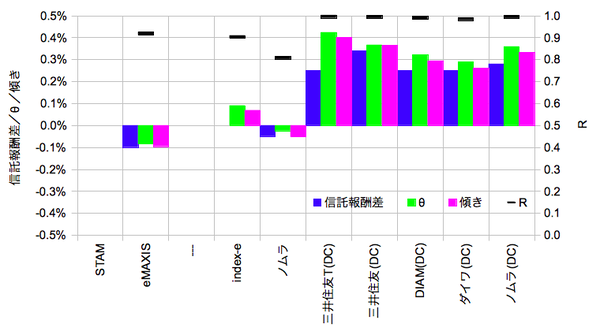「信託報酬差」はスタムとの運用管理費用の差分(@2015/10/30)、「θ」は「arctan(規格化基準価額比@2015/10/30)」であり、この場合のθ(ラジアン)は微小なので単位時間あたりの規格化基準価額比に近似できると考えます。「傾き」は規格化基準価額比の線型近似のスロープ、「R」は線型近似の相関係数です。「θ」「傾き」は365を掛けて年単位に規格化し「信託報酬差」と次元を合わせています。