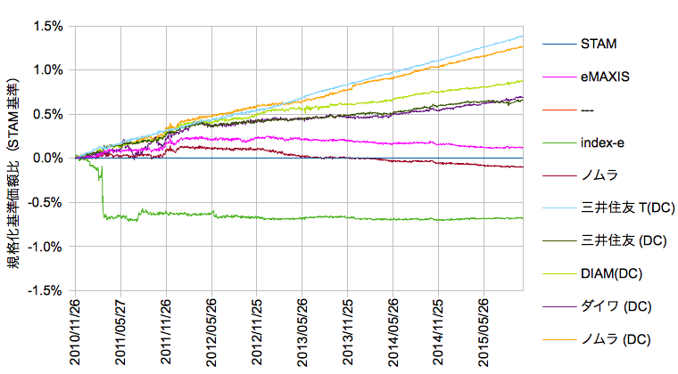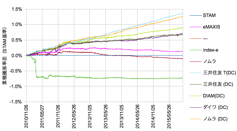 データはMorningstar Japanから、2010/11/26-2015/10/30、分配は非課税再投資で、スタムを軸に基準価額の差分を抽出します。