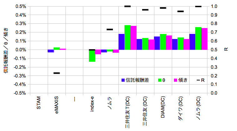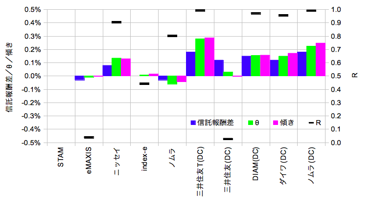 「信託報酬差」はスタムとの運用管理費用の差分(@2015/10/30)、「θ」は「arctan(規格化基準価額比@2015/10/30)」であり、この場合のθ(ラジアン)は微小なので単位時間あたりの規格化基準価額比に近似できると考えます。「傾き」は規格化基準価額比の線型近似のスロープ、「R」は線型近似の相関係数です。「θ」「傾き」は365を掛けて年単位に規格化し「信託報酬差」と次元を合わせています。