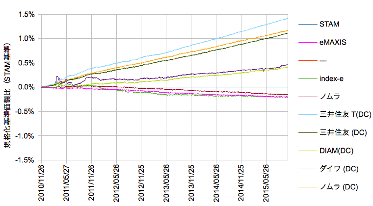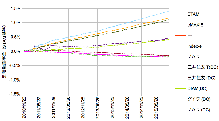 データはMorningstar Japanから、2010/11/26-2015/10/30、分配は非課税再投資で、スタムを軸に基準価額の差分を抽出します。