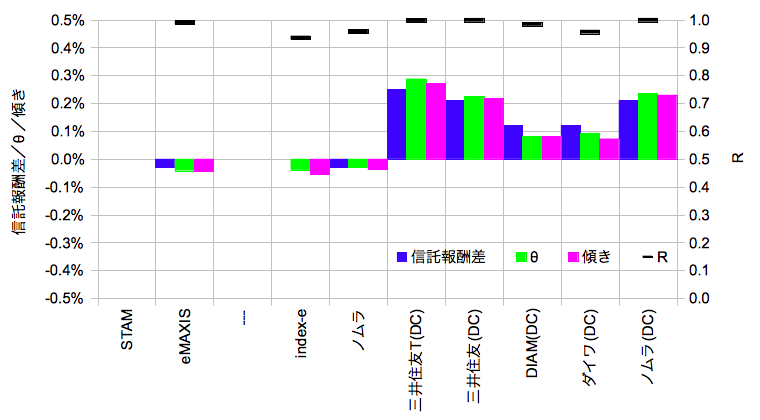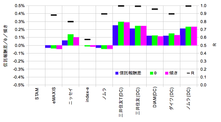 「信託報酬差」はスタムとの運用管理費用の差分(@2015/10/30)、「θ」は「arctan(規格化基準価額比@2015/10/30)」であり、この場合のθ(ラジアン)は微小なので単位時間あたりの規格化基準価額比に近似できると考えます。「傾き」は規格化基準価額比の線型近似のスロープ、「R」は線型近似の相関係数です。「θ」「傾き」は365を掛けて年単位に規格化し「信託報酬差」と次元を合わせています。