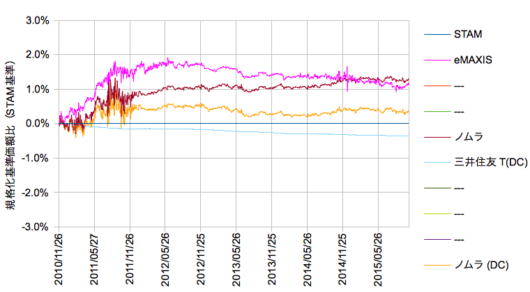 データはMorningstar Japanから、2010/11/26-2015/10/30、分配は非課税再投資で、スタムを軸に基準価額の差分を抽出します。