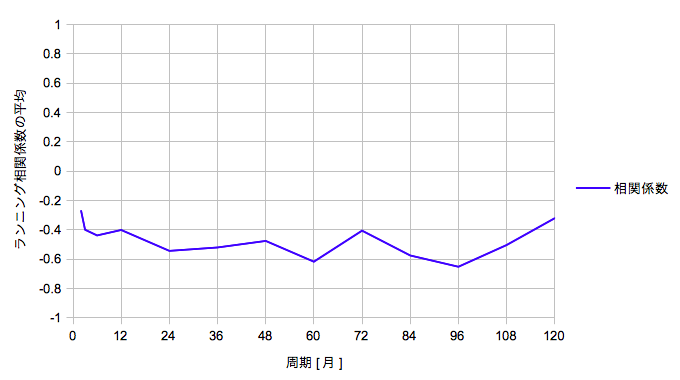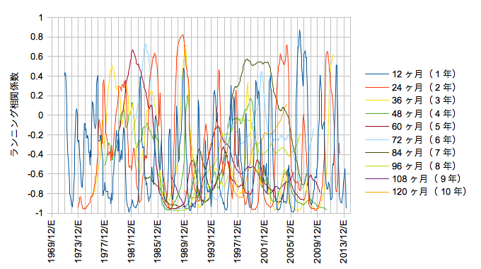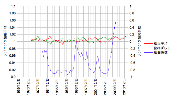 MSCI JAPANインデックス(Monthly/Gross/Local/1969/12/31-2015/05/29)から、所定の周期のランニング相乗平均とそれ自身の位相をずらしたものとの同周期のランニング相関係数を求めてみます。なおMSCI KOKUSAIインデックスも確認しましたが傾向は同様でした。