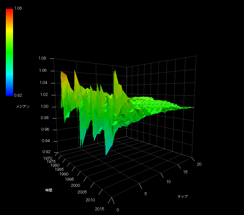 縦軸は言い換えれば「平均値への寄与率」です(規格化はしていません)。分布の中心がプラス側へシフトしていることが、「シグマ」の寄与がゼロに対して非対称であることが、平均値が中央値(ゼロシグマ)を超えることの証明だと考えられます。