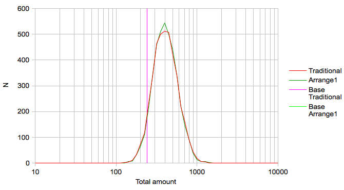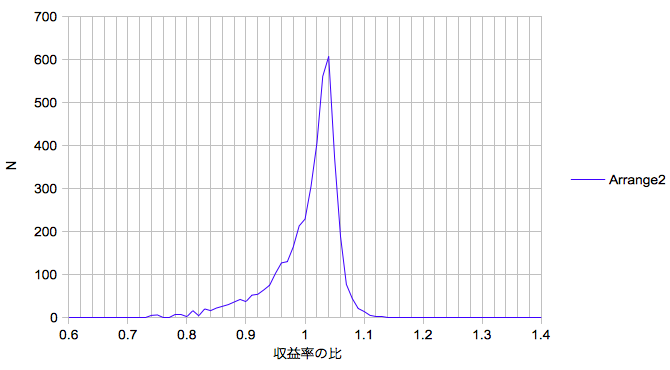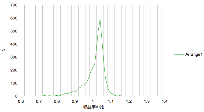 【イコールウェイトが平均であることの離散分布によるイメージ】※r=7%、σ=20%、n=20