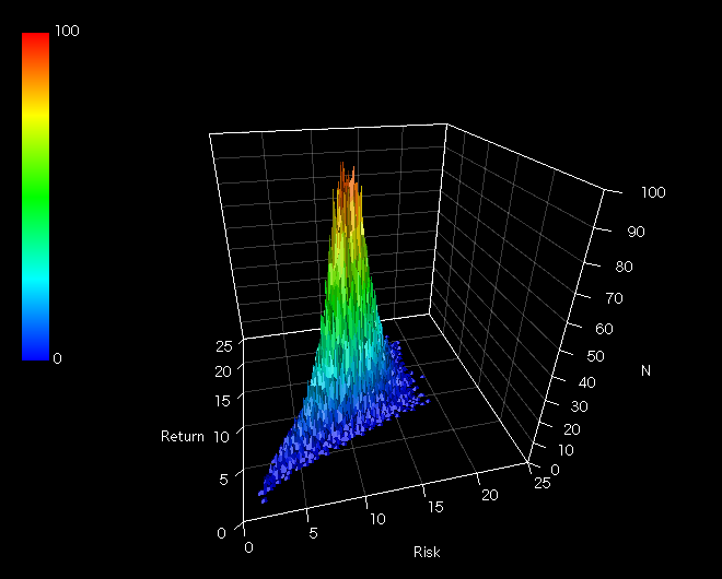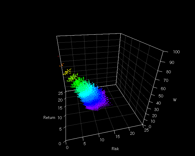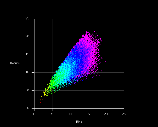 このプロットを求めたのも、1番を狙って特定資産に突っ込むより、分散によるノイズリダクション効果とノイズキャンセル効果を使いこなしてパフォーマンス(シャープレシオ)を上げるような方向にシフトしませんか、ということを示すためです。なお均等型は平均的によい解になりますが、必ずしもベストを保証するものではありません。