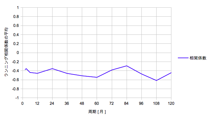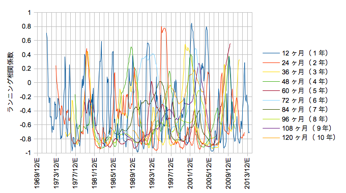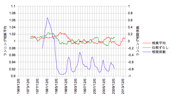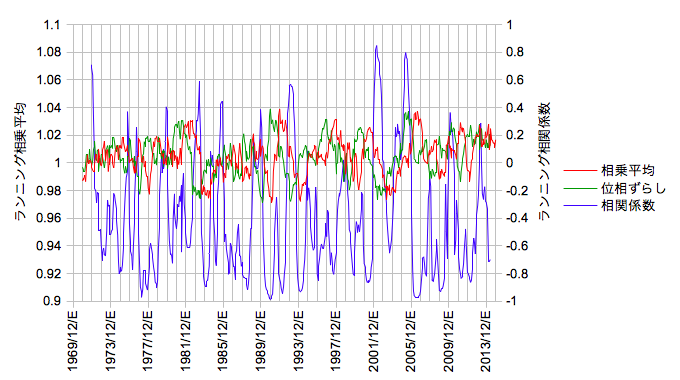 MSCI JAPANインデックス(Monthly/Gross/Local/1969/12/31-2015/05/29)から、所定の周期のランニング相乗平均とそれ自身の位相をずらしたものとの同周期のランニング相関係数を求めてみます。なおMSCI KOKUSAIインデックスも確認しましたが傾向は同様でした。
