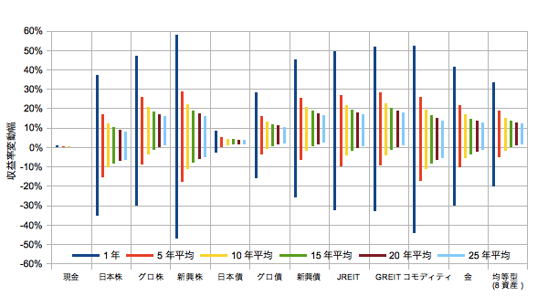 2013/12/EにおけるMSCI JAPANの関連インデックスを参照します。米ドル建てのGrossで、リーマンをまたぐ5年、10年の値を用います。米ドル建てなのはEWIに円建てのFact Sheetが無いからです。換算できなくもないですがめんどいのでこのままでお願いします。