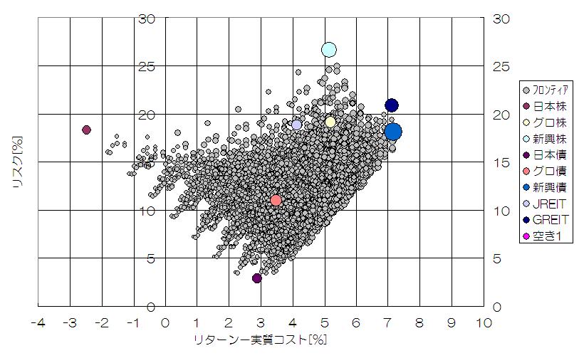 バブルでは実質コストを含めて直感的に判断するのは難しいと思います。本当は3次元プロットが描ければよかったのですが今の環境ではできないので、リターンから実質コストをさっぴいた絵を描きます。