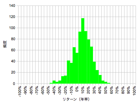 myINDEXさんの資産配分ツールを使わせていただくと、筆者の資産配分では μ=8.2%、σ=18.8%(2010/10現在) なので、この値を用いてシミュレーションをしてみました。