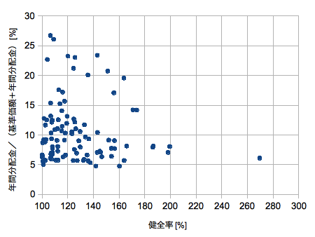 とりあえず配当収益のみで分配を賄うのが王道?のように思うので、SBIで「健全率」100以上(自動的に「余裕月数」が「インカム等の範囲内」になると思われる)でソートしたものの分布を見てみます。横軸を「健全率」、縦軸に「年間分配金と基準価額+年間分配金との比」(いわゆる「分配金利回り」)とします。