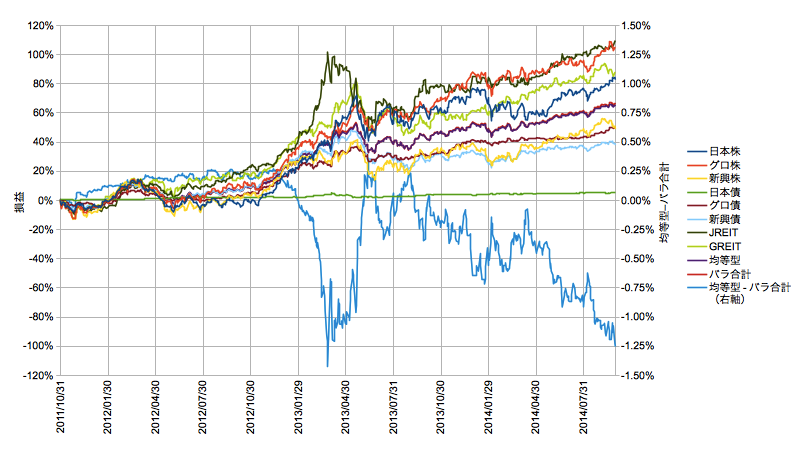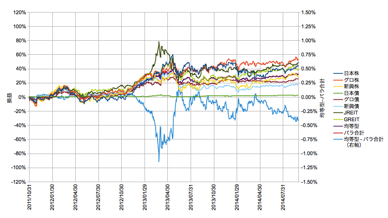 右軸に均等型からバラ売りを引いた差分(水色)を出しています。マイナスほどバラ売りの方が損益もリスクも大きいことを示します。