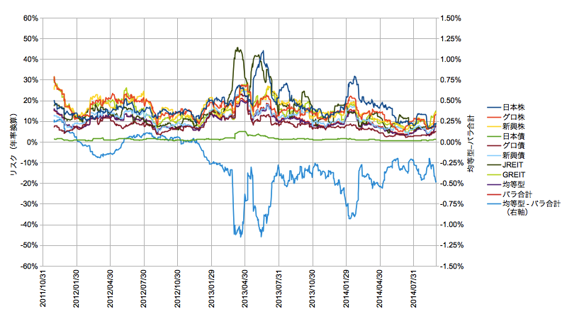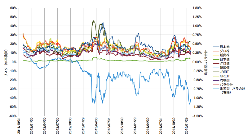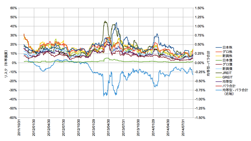 均等型はeMAXIS8資産均等型バランスそのもの、バラ売りはeMAXIS8資産の個々の時系列を元に元本を等分して時価で合計額を算出しています。プロットは2種類で、その時点の損益と、時価の変化率から20日タップで求めた標準偏差を年率に換算したリスクの推移です。