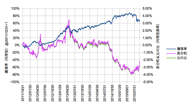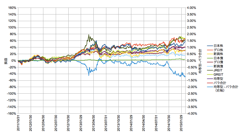 リバランスは解析的に解きにくいのでeMAXISのデータは経時変化の検証にありがたい存在です。このプロットを見ると実にフムフムという知見が得られます。