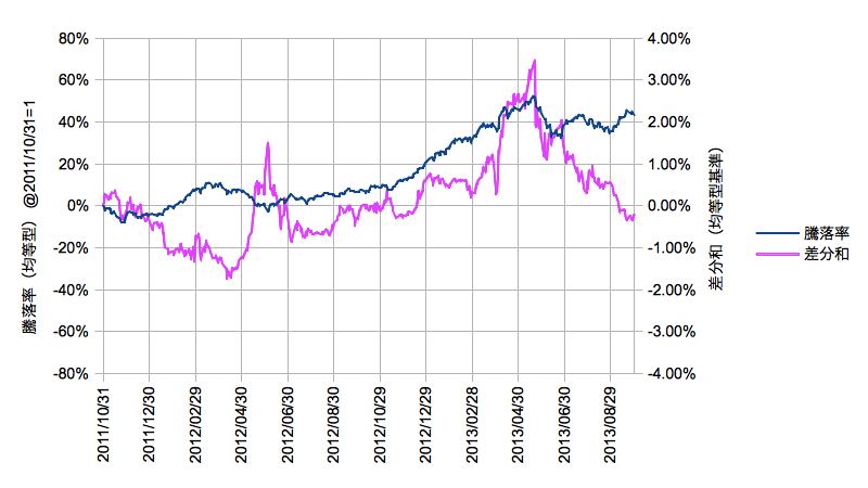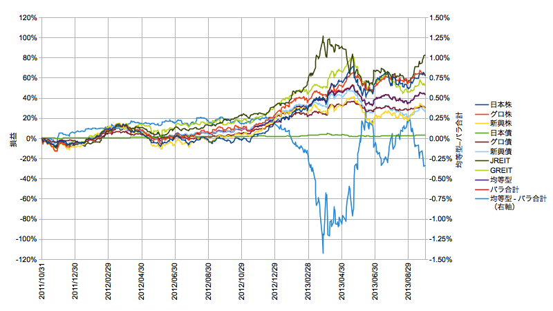 ※私のリバランストリガーがかかったのが2013年3月22日でグラフの損益のピークに近いところです。ただこのタイミングはJREITがズッコケただけで今のところ失敗なのでリバランスの機会を逃すこともアリだと思います。