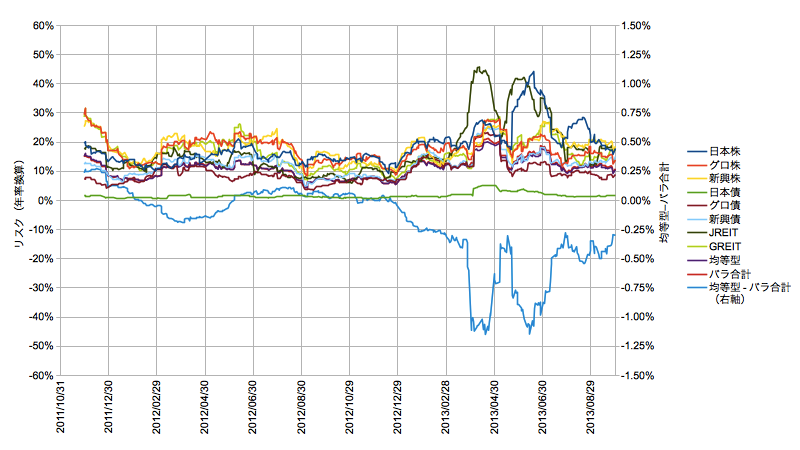 均等型はeMAXIS8資産均等型バランスそのもの、バラ売りはeMAXIS8資産の個々の時系列を元に元本を等分して時価で合計額を算出しています。プロットは2種類で、その時点の損益と、時価の変化率から20日タップで求めた標準偏差を年率に換算したリスクの推移です。