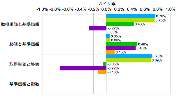 投資信託は基準価額と指数のみなのでカイリの組み合わせは2C2=1通り、対してETFは4C2=6通りの組み合わせがあります。取得単価と終値との違いにより、買ったその日からプラスマイナスが発生するのは投資信託にはないですし、基準価額で購入することも難しいです。こういうのが無駄なシグマだと思います。つくづくETFというものは乖離(指数との連動性)やシグマの重畳に無関心なんだと感じます。信託報酬は簡単に吹き飛ぶし、配当込みかそうでないかも微妙で不透明なところが多い。