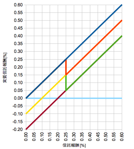ここでゲスい話ではありますが、マイレージも考慮した投資信託の実質信託報酬を見える化してみます。ここではSBI証券が0.25%(税抜)をしきい値に設定していると仮定しています。もちろん信託報酬の内訳によってしきい値は変わりうると思います。
