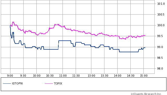 値が「飛ぶ」んですよね。振幅にして6%もの大きな変動です。日中の「指数」の動きがわからないため推定となりますが、複数の銘柄に分散されているなら普通このような現象は起こらないと考えています。つまりこれは指数ではなく取引価格だけが飛んでいると理解しています。