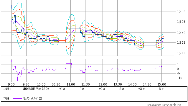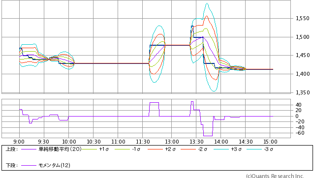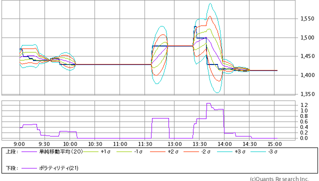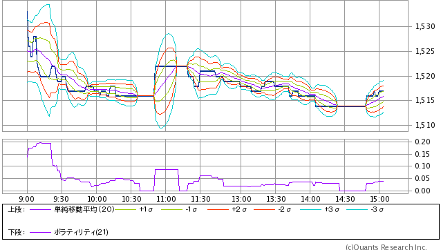 連続的に売買があるような時間帯は2σ程度のレンジには収まっているようです。フラットから突然変化するときなどは軽く3σに達しているようで、移動計算という特性上あまりうまくトレースできていないようにも見えます。