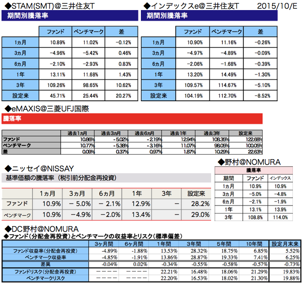 とりあえず各社の月報の「騰落率」の部分を切り貼りしてみました。こうしてみるとわかることがあります。特に「ベンチマーク(インデックス)」の部分に注目なのですが、同じ2015/10/Eで作成されているはずなのに値がすべて異なります。
