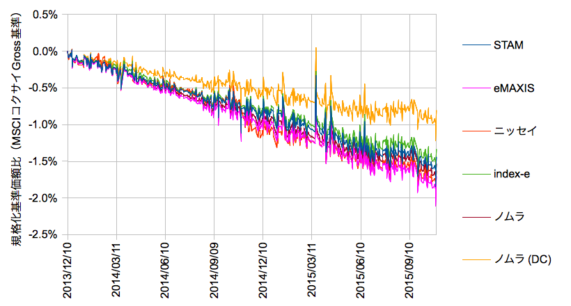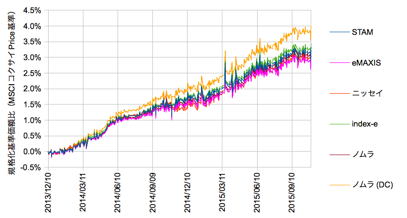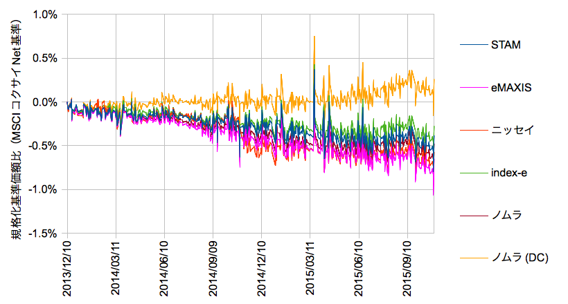 カッコ内は後述する規格化基準価額比の2013/12/10-2015/10/30における最小自乗近似のslopeから年率換算したカイリ率です。二値で求めた結果と相対的にはコンシステントのようです。以下、算出したデイリーのMSCIコクサイインデックス(円)と各ファンドの基準価額の時系列依存を確認しておきます。
