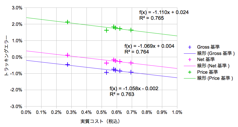 グラフに高周波なギザギザが目立つように、とある一つの期間のみで判断するのは危険ですが、少なくともこの範囲では実質コストとベンチマークとの差分(実質カイリ)に完全な相関があるわけではないようです。