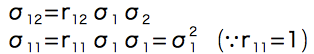 ここで共分散を相関係数と標準偏差シグマを用いて書き換えると、