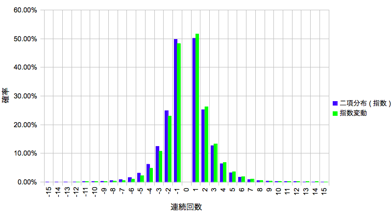 さらにこれを「n回連続する確率」にするには次に反対側が来る確率(連勝/連敗ストッパー)を掛ければよいと思いますがどうでしょう。二項分布を半分にした値になると考えています。
