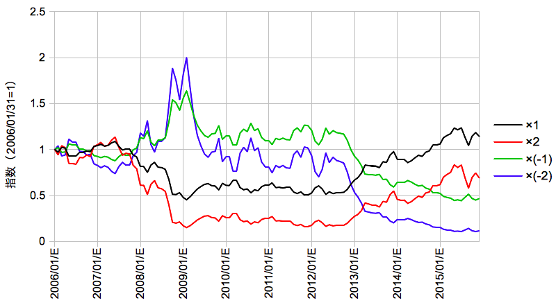 ダブルインバースでもゼロに張り付くまでは至っていないようです。しかし「×(-1)」が「×1」に対して1を挟んで非対称であることが確認できます。特に「×(-1)」がより下側にあることがわかります。また「×1」が1に戻っていても他の「×2」「×(-1)」「×(-2)」はどれも1以下です。これらがレバレッジ/インバース・インデックスの減価特性を示していると考えます。