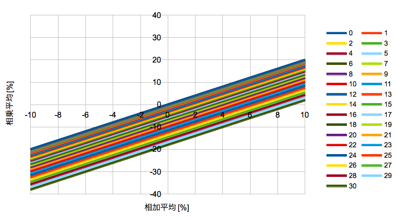つまり「減価の増幅」はレバレッジ型でも起こりえますが、相乗平均の減価はマイナス方向に一方通行なので、レバレッジ側とインバース側でゼロ点に対する非対称性が生じると考えています。